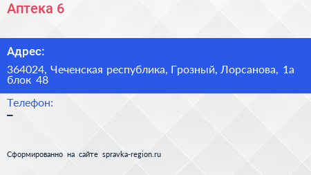 Аптека №6 по адресу 364024, Чеченская республика, Грозный, Лорсанова, 1а блок 48 в дальнейшем Организация, размещена в следующих категориях: