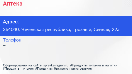 Аптека по адресу 364040, Чеченская республика, Грозный, Сенная, 22а в дальнейшем Организация, размещена в следующих категориях: