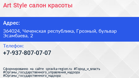 Art Style, салон красоты по адресу 364024, Чеченская республика, Грозный, бульвар Эсамбаева, 2 в дальнейшем Организация, размещена в следующих категориях: