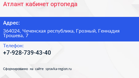 Атлант, кабинет ортопеда по адресу 364024, Чеченская республика, Грозный, Геннадия Трошева, 7 в дальнейшем Организация, размещена в следующих категориях: