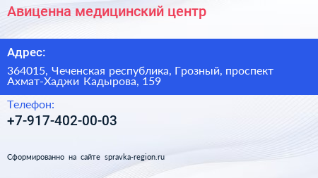 Авиценна, медицинский центр по адресу 364015, Чеченская республика, Грозный, проспект Ахмат-Хаджи Кадырова, 159 в дальнейшем Организация, размещена в следующих категориях: