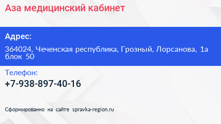 Аза, медицинский кабинет по адресу 364024, Чеченская республика, Грозный, Лорсанова, 1а блок 50 в дальнейшем Организация, размещена в следующих категориях: