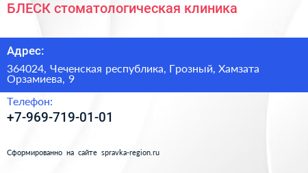 БЛЕСК, стоматологическая клиника по адресу 364024, Чеченская республика, Грозный, Хамзата Орзамиева, 9 в дальнейшем Организация, размещена в следующих категориях: