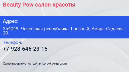 Beauty Pow, салон красоты по адресу 364049, Чеченская республика, Грозный, Умара Садаева, 20 в дальнейшем Организация, размещена в следующих категориях: