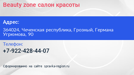 Beauty zone, салон красоты по адресу 364024, Чеченская республика, Грозный, Германа Угрюмова, 90 в дальнейшем Организация, размещена в следующих категориях: