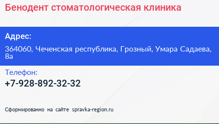 Бенодент, стоматологическая клиника по адресу 364060, Чеченская республика, Грозный, Умара Садаева, 8а в дальнейшем Организация, размещена в следующих категориях: