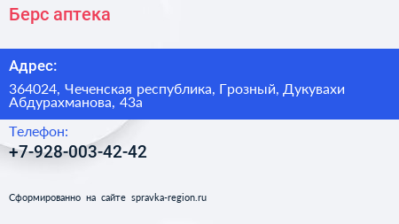 Берс, аптека по адресу 364024, Чеченская республика, Грозный, Дукувахи Абдурахманова, 43а в дальнейшем Организация, размещена в следующих категориях: