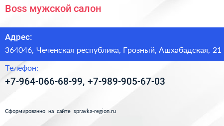 Boss, мужской салон по адресу 364046, Чеченская республика, Грозный, Ашхабадская, 21 в дальнейшем Организация, размещена в следующих категориях: