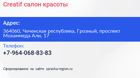 Creatif, салон красоты по адресу 364060, Чеченская республика, Грозный, проспект Мохаммеда Али, 17 в дальнейшем Организация, размещена в следующих категориях:
