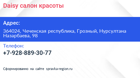 Daisy, салон красоты по адресу 364024, Чеченская республика, Грозный, Нурсултана Назарбаева, 98 в дальнейшем Организация, размещена в следующих категориях: