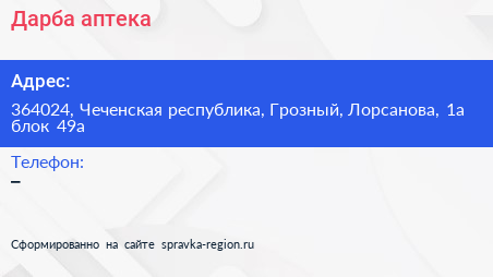Дарба, аптека по адресу 364024, Чеченская республика, Грозный, Лорсанова, 1а блок 49а в дальнейшем Организация, размещена в следующих категориях: