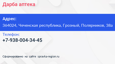 Дарба, аптека по адресу 364024, Чеченская республика, Грозный, Полярников, 38а в дальнейшем Организация, размещена в следующих категориях: