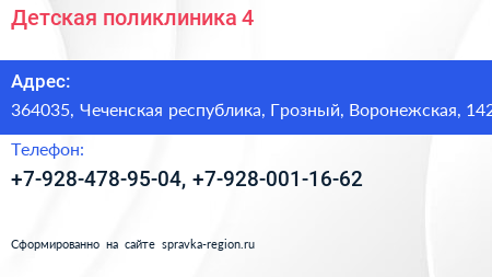 Детская поликлиника №4 по адресу 364035, Чеченская республика, Грозный, Воронежская, 142 в дальнейшем Организация, размещена в следующих категориях: