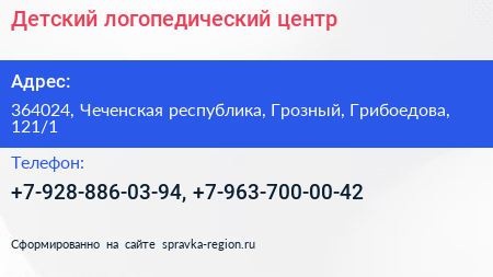 Детский логопедический центр по адресу 364024, Чеченская республика, Грозный, Грибоедова, 121/1 в дальнейшем Организация, размещена в следующих категориях:
