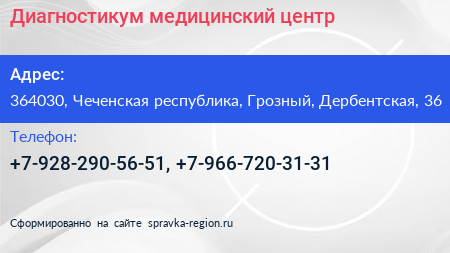 Диагностикум, медицинский центр по адресу 364030, Чеченская республика, Грозный, Дербентская, 36 в дальнейшем Организация, размещена в следующих категориях: