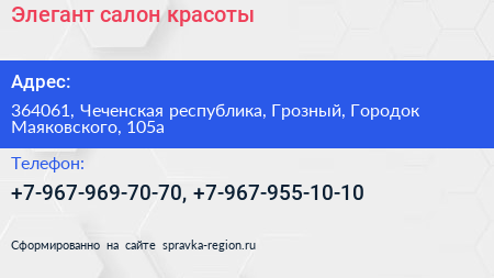 Элегант, салон красоты по адресу 364061, Чеченская республика, Грозный, Городок Маяковского, 105а в дальнейшем Организация, размещена в следующих категориях: