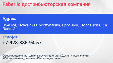 Faberlic, дистрибьюторская компания по адресу 364024, Чеченская республика, Грозный, Лорсанова, 1а блок 34 в дальнейшем Организация, размещена в следующих категориях: