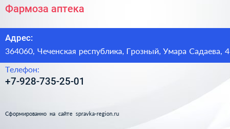 Фармоза, аптека по адресу 364060, Чеченская республика, Грозный, Умара Садаева, 4 в дальнейшем Организация, размещена в следующих категориях: