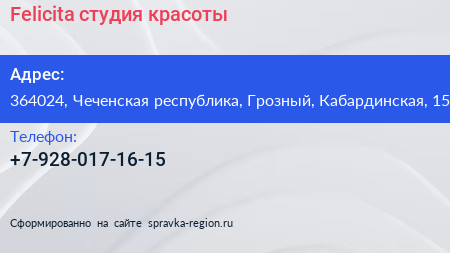 Felicita, студия красоты по адресу 364024, Чеченская республика, Грозный, Кабардинская, 15 в дальнейшем Организация, размещена в следующих категориях: