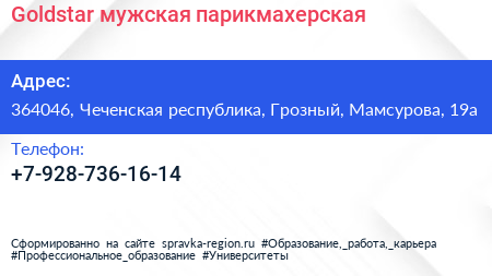 Goldstar, мужская парикмахерская по адресу 364046, Чеченская республика, Грозный, Мамсурова, 19а в дальнейшем Организация, размещена в следующих категориях: