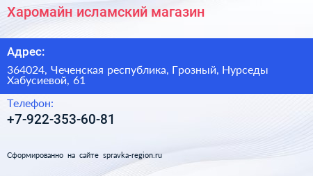 Харомайн, исламский магазин по адресу 364024, Чеченская республика, Грозный, Нурседы Хабусиевой, 61 в дальнейшем Организация, размещена в следующих категориях: