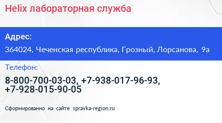 Helix, лабораторная служба по адресу 364024, Чеченская республика, Грозный, Лорсанова, 9а в дальнейшем Организация, размещена в следующих категориях: