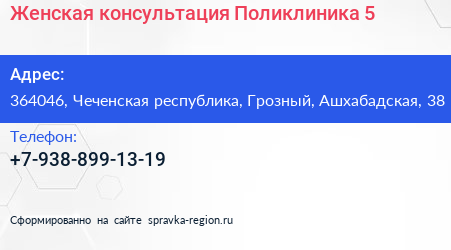 Женская консультация, Поликлиника №5 по адресу 364046, Чеченская республика, Грозный, Ашхабадская, 38 в дальнейшем Организация, размещена в следующих категориях: