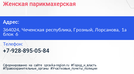 Женская парикмахерская по адресу 364024, Чеченская республика, Грозный, Лорсанова, 1а блок 6 в дальнейшем Организация, размещена в следующих категориях: