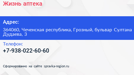 Жизнь, аптека по адресу 364060, Чеченская республика, Грозный, бульвар Султана Дудаева, 3 в дальнейшем Организация, размещена в следующих категориях: