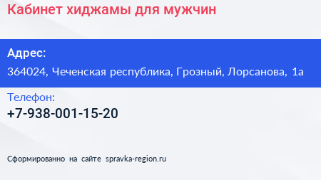 Кабинет хиджамы для мужчин по адресу 364024, Чеченская республика, Грозный, Лорсанова, 1а в дальнейшем Организация, размещена в следующих категориях: