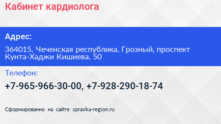 Кабинет кардиолога по адресу 364015, Чеченская республика, Грозный, проспект Кунта-Хаджи Кишиева, 50 в дальнейшем Организация, размещена в следующих категориях:
