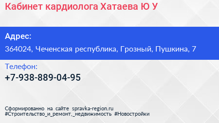 Кабинет кардиолога Хатаева Ю.У. по адресу 364024, Чеченская республика, Грозный, Пушкина, 7 в дальнейшем Организация, размещена в следующих категориях: