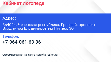 Кабинет логопеда по адресу 364024, Чеченская республика, Грозный, проспект Владимира Владимировича Путина, 30 в дальнейшем Организация, размещена в следующих категориях: