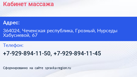 Кабинет массажа по адресу 364024, Чеченская республика, Грозный, Нурседы Хабусиевой, 67 в дальнейшем Организация, размещена в следующих категориях: