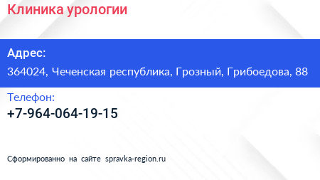 Клиника урологии по адресу 364024, Чеченская республика, Грозный, Грибоедова, 88 в дальнейшем Организация, размещена в следующих категориях: