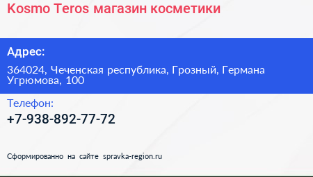 Kosmo Teros, магазин косметики по адресу 364024, Чеченская республика, Грозный, Германа Угрюмова, 100 в дальнейшем Организация, размещена в следующих категориях: