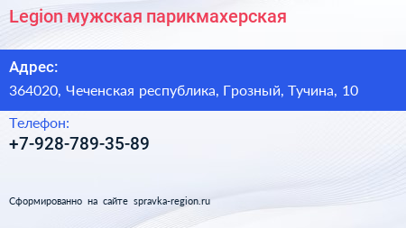 Legion, мужская парикмахерская по адресу 364020, Чеченская республика, Грозный, Тучина, 10 в дальнейшем Организация, размещена в следующих категориях: