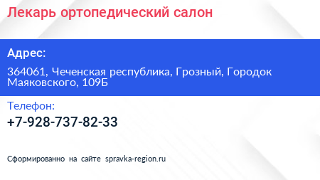 Лекарь, ортопедический салон по адресу 364061, Чеченская республика, Грозный, Городок Маяковского, 109Б в дальнейшем Организация, размещена в следующих категориях: