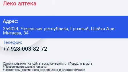 Леко, аптека по адресу 364024, Чеченская республика, Грозный, Шейха Али Митаева, 34 в дальнейшем Организация, размещена в следующих категориях: