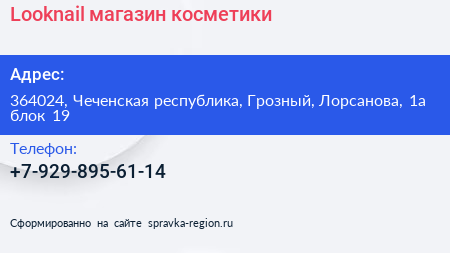 Looknail, магазин косметики по адресу 364024, Чеченская республика, Грозный, Лорсанова, 1а блок 19 в дальнейшем Организация, размещена в следующих категориях: