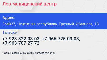 Лор, медицинский центр по адресу 364037, Чеченская республика, Грозный, Жданова, 18 в дальнейшем Организация, размещена в следующих категориях: