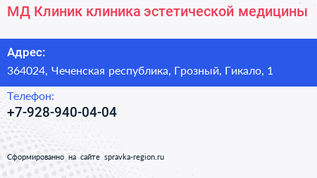 МД Клиник, клиника эстетической медицины по адресу 364024, Чеченская республика, Грозный, Гикало, 1 в дальнейшем Организация, размещена в следующих категориях: