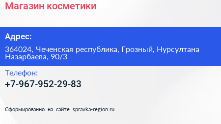 Магазин косметики по адресу 364024, Чеченская республика, Грозный, Нурсултана Назарбаева, 90/3 в дальнейшем Организация, размещена в следующих категориях: