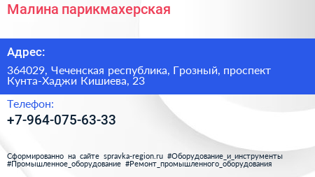Малина, парикмахерская по адресу 364029, Чеченская республика, Грозный, проспект Кунта-Хаджи Кишиева, 23 в дальнейшем Организация, размещена в следующих категориях: