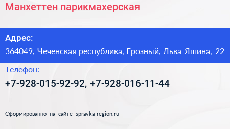 Манхеттен, парикмахерская по адресу 364049, Чеченская республика, Грозный, Льва Яшина, 22 в дальнейшем Организация, размещена в следующих категориях: