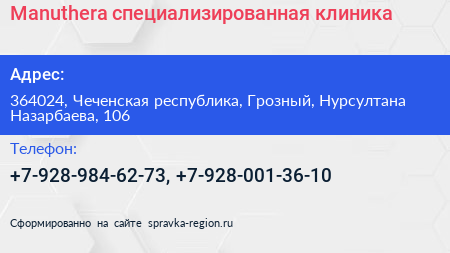 Manuthera, специализированная клиника по адресу 364024, Чеченская республика, Грозный, Нурсултана Назарбаева, 106 в дальнейшем Организация, размещена в следующих категориях: