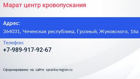 Марат, центр кровопускания по адресу 364031, Чеченская республика, Грозный, Жуковского, 16а в дальнейшем Организация, размещена в следующих категориях: