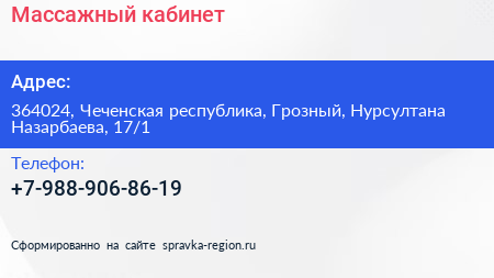 Массажный кабинет по адресу 364024, Чеченская республика, Грозный, Нурсултана Назарбаева, 17/1 в дальнейшем Организация, размещена в следующих категориях: