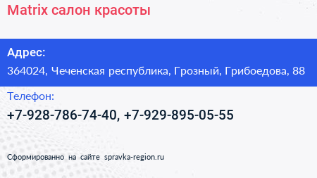 Matrix, салон красоты по адресу 364024, Чеченская республика, Грозный, Грибоедова, 88 в дальнейшем Организация, размещена в следующих категориях: