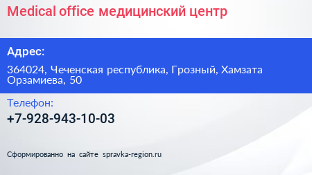 Medical office, медицинский центр по адресу 364024, Чеченская республика, Грозный, Хамзата Орзамиева, 50 в дальнейшем Организация, размещена в следующих категориях: